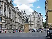Horse Guards Avenue is a road in the City of Westminster, London, linking the major thoroughfares of Whitehall and Victoria Embankment, to the east of the Horse Guards building and parade area. The entrance of the Main Building of the Ministry of Defence (MoD), flanked by its monumental Earth and Water statues, opens onto the Avenue. A statue of a Gurkha soldier, unveiled in 1997, stands as a memorial in front of the Ministry of Defence.