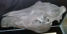 Skull of a horse sacrificed by multiple sword blows during the Iron Age (4-500 AD), found in Nydam Engmose, Denmark, at the Zoological Museum, Copenhagen