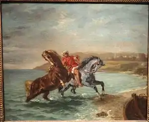 Horses Leaving the Sea or Horses Coming Out of the Sea is an 1860 oil on canvas painting by Eugène Delacroix, signed and dated by the artist in 1860 and now in The Phillips Collection in Washington, D.C.[1] Relatively atypical in Delacroix's oeuvre, it shows two horses leaving the sea led by a Moroccan rider, with the town of Tangiers in the background. It was produced for the same art dealer as Arab Horses Fighting in a Stable and is usually regarded as a pair with that work.[2]
