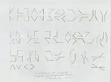 Underlying Hortensia's works is the consistent application of the pictorial alphabet she herself developed with such clarity. "The conscious use of the pictorial alphabet, as a summary of 24 angular connections from combination of a vertical, horizontal or oblique line, becomes with her a drawing procedure for grasping given space."[11] Thus, these pictorial signs are a kind of script for translating vivid reality into the pictorial work. The pictorial alphabet was documented in the book Hortensia - Shape and Space (2014).[12]
