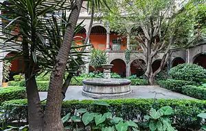 The complex consists of a church and the hospital divided into four sections.[5] The original hospital building is hidden by a Modernist façade, but the façade of the adjacent church is original. After passing the main entrance, one comes to a two-story colonial courtyard filled with plants and a fountain in the center.[1] The hospital courtyard was originally decorated with Tuscan columns, but have since been replaced by equally austere ones. The original staircase remains,[4] which contains a bust of Cortés and past this staircase is a second courtyard.[1] One courtyard was for men and the other for women.[5] The best-known portrait of Cortés can still be seen here. On the frieze of the upper corridors of the south side have a series of small and grotesque faces, which are popularly and mistakenly considered to be those of Cortés’ relatives.[4]