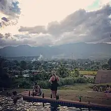 Outdoor pool and shared space at a hostel in Pai, Thailand