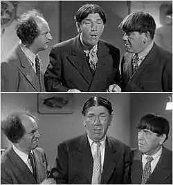 In his review, DVD Talk critic Stuart Galbraith IV noted how poorly new footage (below) was matched with old (above), pinpointing that the Stooges' wardrobes do not match.