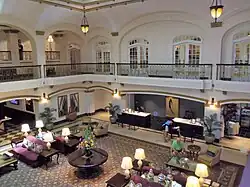 In 1916 the Blackhawk Hotel Corporation expanded with the purchase of the Davenport Hotel, which is located two blocks to the west. Over the next twenty years, Blackhawk Hotels purchased properties in St. Paul, Minnesota and Des Moines and Mason City, Iowa.[6] The corporation was reorganized in 1935. That same year a Junior Ballroom was constructed and the Gold Room was enlarged. A new dining room called the Pompeian Room was opened. The new additions cost $25,000 to complete.[5] Space on the mezzanine level could accommodate 1,000 diners. A sidewalk canopy replaced a marquee over the main entrance in 1955.