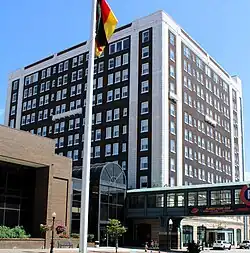 The building is 140 feet (43 m) tall.[12] It is U-shaped to allow for windows in all the rooms and to allow for air circulation and light.[11] The structure is covered in dark-colored bricks that contrast with the white terra cotta. This surface combination sets it apart from the surface monochrome of dressed stone that was being used in other commercial buildings in the city. An elevator shaft was added to the east side of the building in the 1978–1979 renovation. Originally the lobby contained a two-story atrium, but it was enclosed in later years to create additional meeting space. The atrium was restored as a part of the 2010 renovation to the building. A new entrance was also added to the east side of the building facing the parking lot.