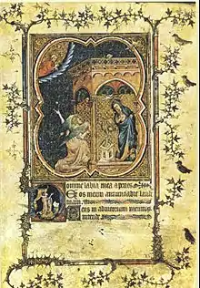 Below a miniature of the Annunciation on folio 13v, the initial D depicts a figure situated under a gold curtain in front of a wall decoration covered with fleurs-de-lys.[2] It has been suggested that this figure represents Philip the Bold.[2] He looks up at the Virgin in the miniature who stands in a standard Gothic pose under a portico and in front of a curtain of a similar pattern.[2] As in traditional Annunciation scenes, the Archangel Gabriel appears from the left side of the scene and points with a dramatic motion towards the angels in the sky and God.[2]