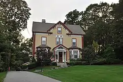 The House at 42 Hopkins Street in Wakefield, Massachusetts is an excellent early example of an Italianate house. Built c. 1850, the 2+1⁄2-story wood-frame structure is an early example of balloon framing (replacing the earlier mortise and tenon style). It is three bays wide, with wide eaves and double brackets, corner pilasters, and a high granite foundation. Its front entry is sheltered by Colonial Revival portico added around the turn of the 20th century.[2]