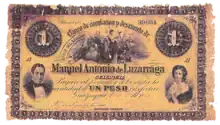 On banknotes printed in London in 1863 by the Bank of Luzarraga, portraits of Manuel Antonio de Luzárraga and his wife Francisca Rico Rocafuerte are present.