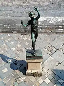 The bronze statue of a dancing faun (actually a satyr, since the lower body is that of a man) is what the House of the Faun is named after. In the centre of the atrium there is a white limestone impluvium, a basin for collecting water. The statue was found on October 26 of 1830 near one side of the impluvium and a small fountain in the center.[4] The original statue is currently located in the National Archaeological Museum (Museo Archeologico Nazionale) in Naples, thus the statue seen today in the house’s ruins is a copy.[5] Fauns are spirits of untamed woodland; they are typically depicted as half human and half goat. Literate and Hellenized Romans often connected their depictions of fauns with Pan and Greek satyrs, who were the wild followers of the Greek god of wine and drama, Dionysus. It is purely a decorative sculpture of high order: "the pose is light and graceful," Sir Kenneth Clark observed.[6]