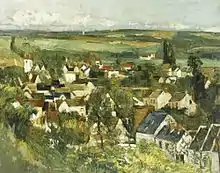 Auvers-sur-Oise was a medieval town about 15 miles northwest of the centre of Paris. It was only a few roads wide, but extended for miles along the river in both directions, vineyards and market gardens scattered all along its length. Its hamlets were a mix of clusters of thatched houses and farm enclosures. The French painter Charles-François Daubigny first moored his studio barge Botin there in the 1850s, and later purchased no less than three houses in the village as well as another nearby.[11] With the advent of a railway, the town became a tourist centre, its population swelling from 2,000 to 3,000 in the summer months. It attracted artists such as Corot, Cezanne and Pissarro, all seeking to capture its rustic charms. Dealers like Theo van Gogh sold thousands of their images.[12]