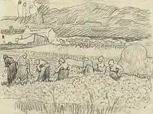 Van Gogh made no paintings of traditional peasant life, la vie rustique, at Auvers of the sort he had formerly made in Nuenen. His sketchbooks contain perhaps just half a dozen or so quick studies of peasant scenes, such as F1615v Landscape with Peasant Women Harvesting (right), as well as a rather larger number of studies of farm animals such as chickens and ponies. His subjects were landscapes, townscapes, portraiture, and still lifes. His paintings at Auvers imply a range of social domains. Thus, his paintings of dwellings range from thatched cottages through to middle-class villas and finally aristocratic châteaus, and these are set within the social spaces of gardens, streets, and the vestiges of feudal domain respectively.[15]
