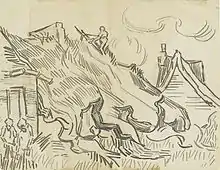- F780 Thatched Cottages in Auvers depicts the thatch on a cottage being renewed. The location is the same one in Chaponval as F759 Houses in Auvers (i.e. the subject of this article), featuring the same house with a pointed roof and distinctive chimney (the leftmost house in F758 is the rightmost house in F780 seen at right angles). However, whereas F759 was painted shortly after van Gogh arrived in Auvers, F780 would seem to have been amongst the last of van Gogh's paintings, as he encloses a sketch of it (right) in his last letter to Theo of 23 July.[upper-alpha 2][L 9] Both Hulsker and De La Faille date it July 1890.[33][34] Both Pickvance and Van Der Veen & Knapp note that it is compositionally similar to F420 Row of Cottages at Saintes Maries painted some two years earlier on a day trip from the asylum at Saint-Rémy.[35][36]
