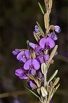 Hovea montana, commonly known as alpine hovea, mountain hovea or alpine rusty-pods,[2] is a flowering plant in the family Fabaceae, and is endemic to Australia. It is a small shrub with narrow leaves and purple pea flowers.[3]