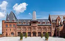 Hradec nad Moravicí is known for the Hradec nad Moravicí Castle. It is a complex formed by the older building, known as White Castle, newer building known as Red Castle, and a large castle park. The original Gothic castle was rebuilt into a Renaissance residence by the Pruskovský of Pruskov family after 1585. The castle was damaged by fire in 1796. It was reconstructed in the Empire style in 1796–1804, and the English-style park was founded. The White Castle has retained its Empire appearance to this day. In the second half of the 19th century, the complex was extended by the neo-Gothic Red Castle with stables, coach rooms and mural wall. The last structure built in the castle complex was the pseudo-Gothic White Tower.[2][3]