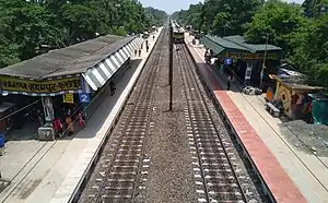 The structure of the station is not so large. There are four entrances, two in each platform. The computerised ticket counter is present in platform no. 1. All the Sealdah and Dum Dum-bound trains arrive at platform no.1 and all the Bangaon, Gobardanga, Thakurnagar, Habra, Duttapukur, Basirhat and Hasnabad bound trains arrive at platform no. 2. A few Hasnabad bound trains are galloping. A foot overbridge connects the two platforms. A level crossing exists at the southernmost end of the railway station.
