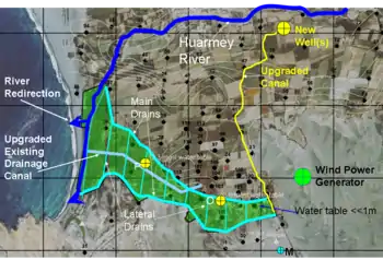 To overcome this problem, the installation of wells to abstract groundwater for supplemental irrigation and lowering of the water table, and drainage by ditches and wells to evacuate the salty percolation water, is being implemented.[2]