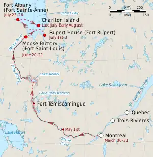 The expedition left Montreal in March 1686, and traveled more than 800 miles (1,300 km) over a period of 82 days. North of Fort Témiscamingue the route had not been explored by white men.[4] The route was up the Ottawa River to Lake Temiskaming, then over portages and down the Abitibi River and Moose River. When they arrived at Moose Factory, it was occupied by 16 men; its governor, John Bridgar, had sailed for Rupert House the day before. In the pre-dawn, brothers Pierre and Jacques Le Moyne led teams quietly into the fort, where they tied down its three cannons before launching an attack on the sleeping garrison. Pierre Le Moyne forced his way into the redoubt housing the defenders, but the defenders shut the gate behind him, and he had to single-handedly defend himself with sword and musket until his soldiers forced the gate open.[4] After a two-hour battle, the garrison surrendered.
