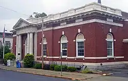- U.S. Post Office: This 1911 brick building at 402 Union Street is one of twelve in New York designed by James Knox Taylor, supervising architect for the Treasury Department in the early 20th century. He had begun to introduce classical ornamentation to the brick Colonial Revival style preferred for post offices, and designed for Hudson two Roman-inspired porticoes similar to those on the county courthouse across the square.[7] In 1988 it was one of the many New York post offices listed on the Register from a statewide Multiple Property Submission.