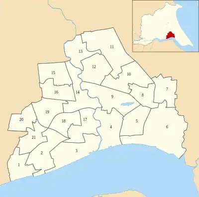 Kingston upon Hull is a unitary authority in the East Riding of Yorkshire, England. Until 1 April 1996 it was a non-metropolitan district in Humberside. A third of the Council is elected each year with no election every four years. Since the boundary changes in 2002 until 2018, 59 councillors are elected from 23 wards with each ward electing either 2 or 3 councillors.[1] Following a review, in 2017, by the Local Government Boundary Commission this was reduced to 57 councillors from 21 wards effective from the 2018 elections.[2]