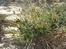 The thick flower heads have glandular, hairy green phyllaries. The center of the daisylike head contains many long golden disc florets and a fringe of golden to reddish ray florets up to 2 centimeters (0.8 inches) long.[4]
