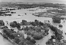 Also because of the highly urbanized nature of the Four Mile Run watershed, the neighborhoods and businesses adjacent to the lower portion of the stream were subjected to repeated flooding, beginning in the 1940s.[7] In response to this flooding, Alexandria and Arlington forged a partnership in the 1970s with the US Army Corps of Engineers (USACE) to build a flood-control channel in the lower portion of Four Mile Run. Construction of that hardened flood control channel - or levee corridor - took place during the 1970s and early 1980s. Today however, Alexandria and Arlington are jointly working to restore this lower section of the stream's natural banks and vegetation by “greening” it, along with installing new paths, crossovers and other amenities that will serve the population around the future Potomac Yard metro station. This is part of the Joint Four Mile Run Restoration Master Plan, a $261 million plan to transform the stream corridor. Throughout 2015 and 2016 the media and government officials highlighted the completion of the $1.8 million Four Mile Run Tidal Restoration Demonstration Project that restored the historic 2-acre tidal wetland where the water levels fluctuate with the daily tidal cycle along Four Mile Run.[8]