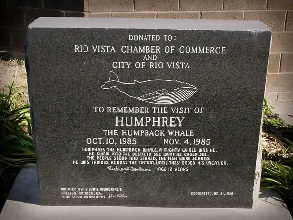 As they approached the San Francisco Bay and the water gained in salinity, Humphrey became visibly excited and began sounding. Though the crew lost sight of him that night, they picked him back up in the morning and led him out through the Golden Gate bridge into the Pacific Ocean on November 4, 1985, at 4:36 p.m.[9] The town of Rio Vista later erected a commemorative granite marker at City Hall at the east end of Main Street.[7][10] A restaurant in Antioch was named Humphrey's in the whale's honor. The restaurant has since been remodeled and its name changed to 'Smith's Landing Seafood Grill'.[11]