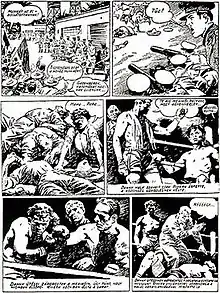 - Imre Sebők [69] (Apostag, 6 August 1906 – Budapest, 14 September 1980)[70] painter, cartoonist, graphic artist. After art schooling at Jenő Feics and Tibor Pólya, Sebők studied at the Academy of Fine Arts under the instruction of Oszkár Glatz and Aurél Bernáth, but left school after two years for financial reasons. Besides being a regular illustrator at Tolnai világlapja (Tolnai's world magazine), his illustrations were frequent at Délibáb (Mirage), Ünnep (Holiday), Párizsi Divat (Parisian Fashion), Magyar Cserkész (Hungarian Boyscout). His first "subtitled" pictorial stories were published in Gyermekvilág (Child World) in 1942. His painted covers and illustrations for magazines and pulp novels made him widely known, earning an invitation to draw Tarzan comics in Canada, but he did not accept the offer.[70] Besides Pál Korcsmáros, after 1945 he became one of Pesti Izé (Pest Whatchamacallit)'s star illustrator, with slightly erotic images. His comics (usually adaptations written by Tibor Cs. Horváth) were mostly published in Magyar Ifjúság (Hungarian Youth) (after 1958), Népszava (People's Voice) (after 1962). After 1966, exhausted by the daily strips for Népszava, his art became less detailed, sketchy. The daily rush being already behind him made it possible for the artist to reach his second peak from 1973 till his death in 1980.[71] His style is closest to Alex Raymond and Burne Hogarth with the difference that he never made a compromise in favor for better understanding and vendibility.[72] A master of anatomy, his characters' movement are perfect, the static view points are counterpointed by dramatic lighting compositions and emphasized expressive hand gestures.[72][73]