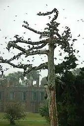 Huge tree swallow flock preparing for fall migration takes refuge from the rain on a snag in front of Atalaya