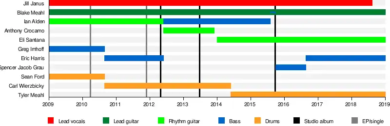 In October 2015, Janus posted a now-deleted note on Facebook announcing the band would finish its activities, but that she would continue to make music.[3] Lead guitarist Blake Meahl, however, dismissed her statement as a consequence of her health and mental issues, and said the band would continue to perform.[4] On August 14, 2018, Jill Janus died by suicide.[5][6][7]