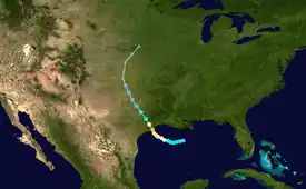 Alicia weakened as it accelerated northwest into the Texas interior, with the hurricane's center passing just west of Downtown Houston on the morning of August 18 as a Category 1 hurricane;[4] the storm was initially slow to weaken as it was able to rein in moist air from the warm Gulf of Mexico.[5] Later that day, the continued inhibitory impacts of friction and dry air weakened Alicia to a tropical storm near College Station, Texas,[9] and degenerated into a tropical depression early on August 19 near the Dallas–Fort Worth metroplex.[4] Despite having remained over land for 36 hours, Alicia remained well-organized while tracking into Oklahoma on August 20.[10] The tapering system transitioned into an extratropical cyclone later that day; these remnants persisted for another day before they were absorbed by a passing trough over eastern Nebraska on August 21.[1][4]