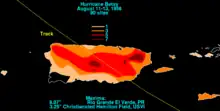 When Betsy crossed Puerto Rico, it produced hurricane-force winds across the entire territory except in the southwest corner. Sustained winds reached 73 mph (117 km/h) in San Juan, and Ramey Air Force Base on the island's northwestern portion recorded 115 mph (185 km/h) wind gusts.[1] The high winds downed a significant number of trees in the island's interior due to the funneling within valleys. In Aibonito, the winds destroyed 1000 houses and damaged another 500, and in nearby Comerío the winds severely damaged or destroyed 1285 dwellings. In Jayuya in the central portion of the island, the hurricane left severe crop damage, including a complete loss to the banana crop. However, damage was heaviest in Yabucoa near where Betsy moved ashore,[5] due to a slight oscillation of the eye. High winds caused severe damage in a 20 mi (32 km) radius.[2] In Yabucoa, over 12,000 people were left homeless, and damage totaled $8 million. Damage was likewise severe where Betsy moved offshore in Camuy, with a complete loss to the corn crop, 95% of the avocado, 65% of breadfruit, and 50% of the coffee crop ruined.[5] The hurricane dropped heavy rainfall in the central portion of the island,[4] with a peak 24‑hour total of 8.72 in (221 mm) in Río Grande.[2] The same station recorded a total of 9.07 in (230 mm), which was the highest total related to Betsy's passage.[6] Across Puerto Rico, Betsy destroyed 15,023 houses and left $40 million in damage. There were sixteen deaths on the island,[1] which was less than expected due to well-heeded warnings.[5] There were also 24 injuries in the territory related to the storm.[7] Betsy was the first hurricane on record to be observed from the San Juan radar.[4] On the island, it is known as the Santa Clara hurricane.[2] Due to the damage, U.S. President Dwight Eisenhower declared Puerto Rico as a disaster area on August 18, which allocated millions of dollars in assistance.[7][8] The Puerto Rican governor allocated $6.7 million of funding to aid in rebuilding.[7]