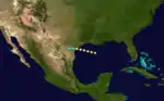 By August 16, a strong hurricane was located in the northwestern Gulf of Mexico south of Louisiana. With estimated winds of 105 mph (169 km/h), it tracked westward and struck Texas on Matagorda Island before passing near Refugio. The hurricane quickly weakened over land and dissipated late on August 17.[4] Damage from the hurricane was heaviest in Refugio and Indianola. In the latter city, strong waves damaged wharves and boats while the storm surge flooded the streets with about 1 ft (0.30 m) of water. Intense winds knocked down several houses as well as a church, and many buildings lost their roofs. In Sabine Pass, the winds ruined a variety of fruit crops.[6]