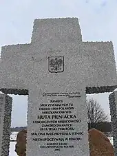On February 28, 1944 almost all the villagers of Polish ethnic background were murdered,[2] and the village razed during the Huta Pieniacka massacre in a pre-planned pacification action,[3] by the 4th police regiment, which was later adjoined to the SS Galizien (the conclusion of both Polish and Ukrainian historical commissions).[4][5] The village of Huta Pieniacka no longer exists. Most of the houses were burned during the massacre and only the school and a Roman Catholic church remained. Both of these buildings were demolished after the war, and in the area of the village there is a pasture for cattle. There is a post with a Ukrainian inscription Center of the former village, but it does not mention the name of the village.