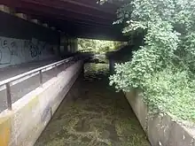 At the 65-acre (26 ha) V-shaped lake the Hutchinson has descended to 184 ft (56 m).[20] It flows out through a narrow spillway on the lake's southeastern shore, crossing under a footbridge and then immediately bending southwest[21] to begin several miles of closely paralleling the Hutchinson River Parkway, a four-lane limited-access grade-separated highway. The river goes through a series of culverts under the ramps of the parkway's Mill Road exit immediately to the south.[22] While still flowing close by the parkway, it enters the mostly wooded Twin Lakes County Park, the least developed area it has flowed through by this point.[23]