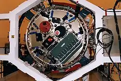 This instrument is a gas chemical analyzer that was designed to identify and measure chemicals in Titan's atmosphere.[17] It was equipped with samplers that were filled at high altitude for analysis. The mass spectrometer, a high-voltage quadrupole, collected data to build a model of the molecular masses of each gas, and a more powerful separation of molecular and isotopic species was accomplished by the gas chromatograph.[18] During descent, the GC/MS also analyzed pyrolysis products (i.e., samples altered by heating) passed to it from the Aerosol Collector Pyrolyser. Finally, the GC/MS measured the composition of Titan's surface. This investigation was made possible by heating the GC/MS instrument just prior to impact in order to vaporize the surface material upon contact. The GC/MS was developed by Goddard Space Flight Center and the University of Michigan's Space Physics Research Lab.