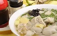 The now popular Huzhou style Wonton dish is known to be introduced by an ingenious man named Zhouji. It is said that in 1930, Mr. Zhouji saw how profitable Ding Lianfang's roadside restaurant (began in 1878) was by serving a noodle bowl with bean curd dumplings. As a result of this observation, Zhouji also opened a store to compete for the same clients. Soon after, Mr. Zhouji found that his roadside restaurant could not replicate his competitors profit and was forced to close. However, considering what his competitor did not sell, he rethought his plans. He opened a new roadside restaurant called "Zhou Shengji's". Unlike his first venture, this one made a profit. He sold a wonton bowl with flower dumplings filled with various ingredients. The dumplings could have pork, with your choice of mix such as celery, bamboo, or spinach. And Zhou Shenji's cooks continue to be very particular about the quality of dumpling they serve. They select all the raw materials very carefully, such as wheat flower, sesame, sesame oil, wine, sugar, salt and other spices that need to be added to create the flower dumpling shell. Furthermore, Zhouji invented a special process so that dumplings do not break up easily when boiled. Combined with a special sauce, the dumplings have a satisfying taste and thus are a very popular dish.