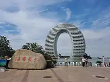 Left to right, top to bottom: the twin towers of Soochow International Plaza viewed from Xiangwang Park, the Huancheng River at night, skyline seen from Renhuang Mountain with the Huzhou Olympic Stadium visible, the Sheraton Huzhou Hot Spring Resort, Yishang Street, and Laohutan Reservoir south of the city | |