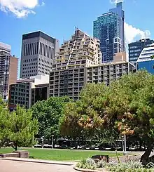 In 1910 Sydney's first women's public lavatory was built in the park near the corner of Park and Elizabeth Streets. It was considered a "failure" by Council due to low usage and was replaced in 1955.[13] In 1912 the park was redefined following the widening of College Street. Mark Foys Emporium (south-west corner of Liverpool & Elizabeth Streets) was built in 1909 opposite the park. This was one of the largest and grandest department stores in the city, growing over time to six stories. When trains (i.e. after 1926) were the most popular method of goring to town the store thrived because of its proximity to the underground railway station.[1][36]