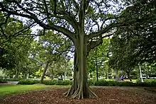There was a move to include native plants and E.H.Ward, curator of Sydney Botanic Gardens, became the chief adviser – he was responsible for the planting of the great, dense avenue of Hill's figs (Ficus microcarpa var. 'Hillii'). This ran along the central walkway aligned with Macquarie Street, and was established as its major axis. Desirable attributes were listed: the need for shade, restriction of plant species, open grassed areas rather than shrubberies. Specimen trees were considered 'out of place'; flower beds were tolerated in restraint.[1]