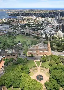 In 1832 William and Macquarie Street (southern extension) were constructed severing Hyde Park and establishing its central axis.[21] Also in 1832 College Street was built which divided off part of the park, in the area which became Cook and Phillip Parks. Also in 1832 Sydney College was built (later Sydney Grammar School). With the nearby Lyons Terrace (1851) and the Australian Museum (1849–51) the southern end of Hyde Park attracted significant and imposing buildings which increased its importance as a planned open space envisaged by Francis Greenway.[1][13]