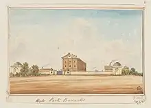 The accommodation soon proved inadequate and up to 1400 men were housed in the Barracks at any one time. It has been estimated that perhaps 30,000 men and boys passed through the Barracks between 1819 and 1848.[12] The convict response to the Barracks was somewhat mixed: those that were able to pay for lodgings by working on Saturday were not happy about the confinement; others were happy to have a roof over their heads. In 1820, in order to ease the pressure on the crowded Barracks the reward of being allowed to live outside the Barracks was extended. Convicts found gambling, drunk, engaged in street violence, or other unseemly behaviour had this freedom revoked and were sent to live in the Barracks. It had become a form of punishment. Loitering or idling on a Saturday was also punishable by confinement to the Barracks. Convicts had a peculiar mix of detention and freedom, convicts had to work for the Government during the week, but were allowed to work for their own benefits on Saturdays. This was a privilege Governor Macquarie did not like to see abused.[7]