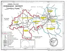 Hyderabad district was formed in 1948 after Operation Polo by merging Atraf-a-Balda District and Baghat District. Baghat was previously a Taluk in Atraf-e-Balda District, and was made a separate district in 1931–34 under the subedar of Medak division. After formation of Andhra Pradesash by merging Telugu speaking of Hyderabad state in 1956 Hyderabad district boundary was altered Tandur Taluka which is Telugu speaking region of Gulbarga district was merged in Hyderabad district and Parigi Taluka of Mahabubnagar district and Vikarabad Taluka of Medak District also merged in Hyderabad district.[2] In 1978 Hyderabad district was later split into Hyderabad Urban District and Hyderabad Rural District. Hyderabad Urban District was made by 4 Talukas are Charminar, Golkonda, Mushirabad and Secunderabad Talukas. Hyderabad rural district was later renamed as Ranga Reddy District.[3] Hyderabad Urban district subdivided in 16 Mandals in 1985 and consist of 2 Revenue division[4][5]