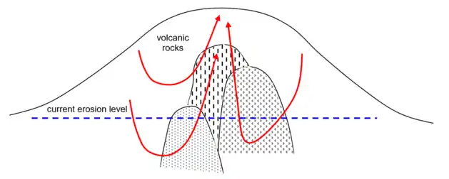 Finally, volcanic activity ceased and erosion removed the upper portions of the volcano and exposed the intrusive rocks and stockwork mineralization that used to lie within.[17]
