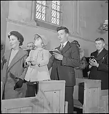 In Christianity, church congregations often sing hymns together as part of their worship (Pictured: worshippers at Uffington Parish Church in England, 1944)