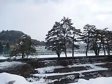 Hyouka features several real-life locations in Takayama. The Kamiyama Senior High School, which appears in the opening and each episode, is based on Hida Senior High School. The Kajibashi bridge, which goes across the Miyagawa river, is also featured in the opening and Episode 18. The Miyagawa Morning Market Street is also featured in the opening. The Arekusujinja Shirne, featured in Episode 20 and the opening, is based on the Hiejinja shrine. Other sites include the Yaoihashi Bridge shown in the opening and Episodes 11 and 18, the Hirayu Onsen Hot Springs shown in Episode 7, the Takayama City Library (as Kamiyama City Library) in Episode 18, and the Minashi Shrine and Garyu Cherry Trees shown in Episode 22.[9]