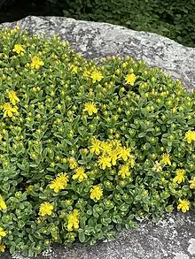 Buckley's St. Johnswort is a small shrub, growing up to 45 cm (18 in) tall and spreading to form low, compact mats. It has peeling, reddish stems with thin bark. The oblong or oblanceolate leaves are sessile or subsessile, up to 25 mm (0.98 in) long and 12 mm (0.47 in) broad. The species typically flowers in early July, typically they only produce one blossom per flowerhead, but there may be up to 5.[4] The flowers are 20–25 mm (0.79–0.98 in) across with 5 golden yellow petals, becoming reflexed with age. The ovaries have three parts, forming narrowly ovoid to cylindric capsules.[2]