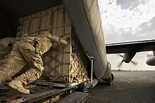 The use of standardized steel shipping containers began during the late 1940s and early 1950s, when commercial shipping operators and the US military started developing such units.[19] In 1948 the U.S. Army Transportation Corps developed the "Transporter", a rigid, corrugated steel container, able to carry 9,000 pounds (4,100 kg). It was 8 ft 6 in (2.59 m) long, 6 ft 3 in (1.91 m) wide, and 6 ft 10 in (2.08 m) high, with double doors on one end, was mounted on skids, and had lifting rings on the top four corners.[20] After proving successful in Korea, the Transporter was developed into the Container Express (CONEX) box system in late 1952. Based on the Transporter, the size and capacity of the Conex were about the same,[nb 2] but the system was made modular, by the addition of a smaller, half-size unit of 6 ft 3 in (1.91 m) long, 4 ft 3 in (1.30 m) wide and 6 ft 10+1⁄2 in (2.10 m) high.[23][24][nb 3] CONEXes could be stacked three high, and protected their contents from the elements.[21] By 1965 the US military used some 100,000 Conex boxes, and more than 200,000 in 1967,[23][27] making this the first worldwide application of intermodal containers.[21] Their invention made a major contribution to the globalization of commerce in the second half of the 20th century, dramatically reducing the cost of transporting goods and hence of long-distance trade.[28][29]