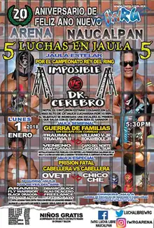 In late 1995 Adolfo Moreno decided to create his own promotion, creating a regular roster instead of relying totally on wrestlers from other promotions, creating the International Wrestling Revolution Group (IWRG; sometimes referred to as Grupo Internacional Revolución in Spanish) on January 1, 1996.[3] From that point on Arena Naucalpan became the main venue for IWRG, hosting the majority of their weekly shows and all of their major shows as well.[4][5] The first IWRG Anniversary Show was held on January 1, 1997 with all subsequent shows being held on or right after January 1 each year, all at Arena Naucalpan.[4]