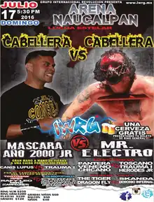 - 1 2 3 4 5 6 7 8 9 10 Lizarraga, Alfonso (July 18, 2016). "Mascara Año 2000 Jr. se queda con la cabellera de Mr. Electro" [Mascara Año 2000 Jr. takes the hair of Mr. Electro.]. The Gladiatores (in Spanish). Retrieved April 12, 2019.