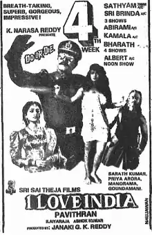 I Love India is a 1993 Indian Tamil-language action film directed by Pavithran.[1] The film stars Sarathkumar, débutante Tisca Chopra and Shenbagam. It was released on 14 October 1993 and failed at the box office.